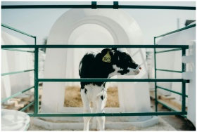 Black and white calf stands in a clean outdoor cat