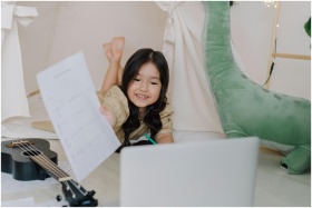 Happy child learning ukulele online at home with s
