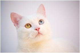 A fluffy white cat with one blue and one yellow ey