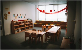 Inviting kindergarten classroom with tables, chairs, and colorful decorations, fostering a welcoming learning environment.