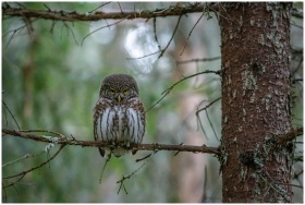Close-up of Eurasian pygmy owl (Glaucidium passerinum) perched on tree branch in woodland.