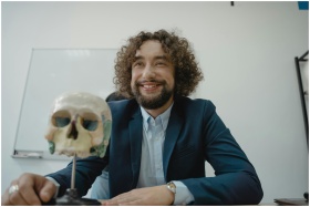 Engaging teacher with a model skull in a classroom, symbolizing knowledge and science education.