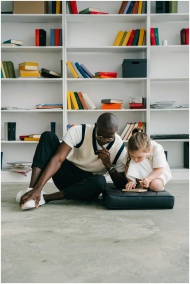 A dedicated tutor helps a young girl with her tabl