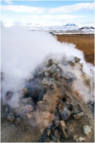 Geothermal steam rising from rocks in a snowy Icelandic landscape.