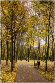 Peaceful park pathway adorned with golden autumn l