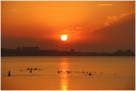 Beautiful sunset view over the Azerbaijani coastline with people enjoying the serene waters.