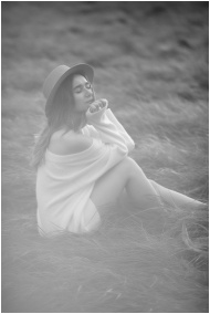 Black and white portrait of a woman in a hat sitting peacefully in a grassy field.