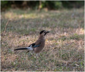 A Eurasian Jay standing on grass in İzmir, Türkiye