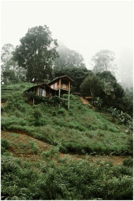 Charming wooden house on a lush, misty hillside in Sri Lanka's Central Province, surrounded by dense forest vegetation.