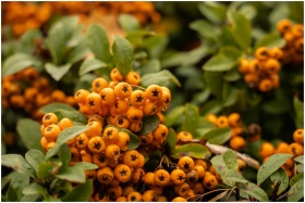 Close-up of vibrant orange pyracantha berries surrounded by lush green leaves.