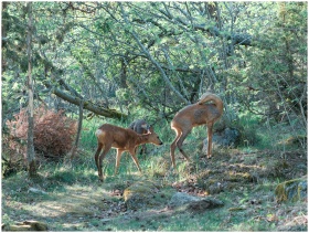 Two deer stand in a lush Californian forest, creat