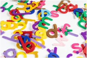 Bright and colorful felt letters scattered on a wh