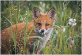 A young red fox peeking through grass in the wild,