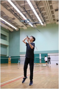 A boy in motion playing badminton indoors, showcas