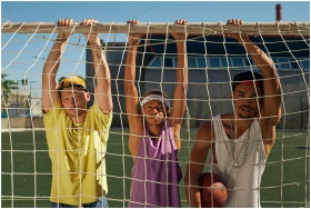 Three diverse young men pose confidently on a soccer field, hanging onto the goalpost wearing casual streetwear.