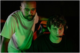 Two people engaged in a gaming session, one wearing a headset, focused on the screen.