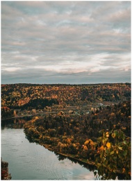 A breathtaking aerial shot capturing a vibrant fall forest and a winding river under a cloudy sky.