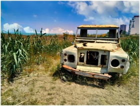 A vintage rusty truck surrounded by tall grasses in the Mazandaran province, Iran. Blue sky backdrop.