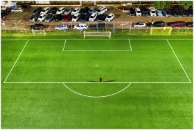 Aerial view of a soccer field at night in Jakarta with a lone player casting a shadow under stadium lights.
