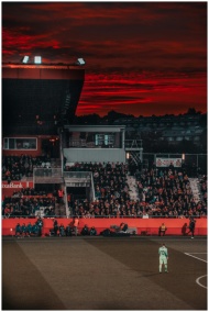 A vibrant soccer match in a stadium with spectators and a stunning sunset backdrop.