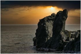 A striking rock formation silhouetted against a vibrant sunset over the ocean.