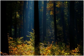 Autumn sunlight filters through a Romanian forest,