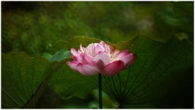 Close-up of a vibrant pink lotus flower blooming amid lush green leaves.
