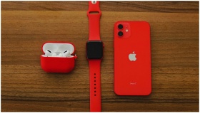 Top view flat lay of red apple watch, iPhone, and AirPods on wooden table.