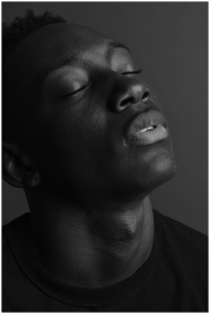 Emotive black and white portrait of a young man, eyes closed, in a studio setting.