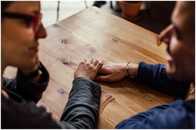 A couple shares a romantic moment holding hands across a wooden table indoors.