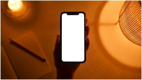 A hand holds a smartphone with a blank screen, illuminated by warm ambient light. Ideal for mockup designs.