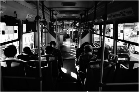 A monochromatic view of passengers inside a moving bus in Mexico City.