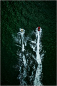 Dynamic aerial shot capturing two jetskiers speeding on a vibrant green sea, creating thrilling trails.