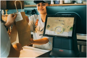 A smiling cashier hands a paper bag to a customer at a modern point of sale, showcasing customer service.
