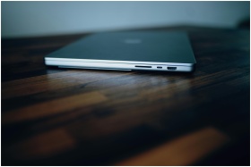 Side view of a closed laptop showing its ports on a stylish wooden surface.