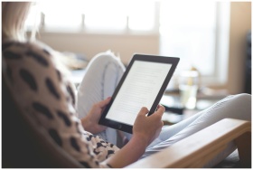 A woman enjoys reading on a tablet, sitting comfortably in a modern living room.