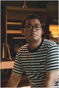 Indoor portrait of a man with glasses wearing a striped shirt, showcasing calm expression in Dalat, Vietnam.