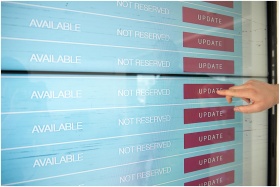 A hand interacts with a digital touchscreen interface showing availability and update options.