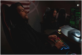 Young adults working on cybersecurity tasks in a dimly lit tech environment.