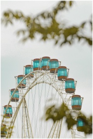 Close-up of a Ferris wheel seen through leaves, de