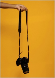 A DSLR camera suspended by hand against a vibrant