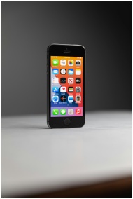 Close-up of a black smartphone displaying various app icons on a white surface.