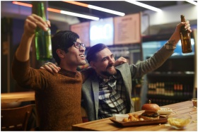 Two men enjoying drinks and food in a lively bar s