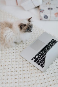 A fluffy cat curiously observes a laptop placed on