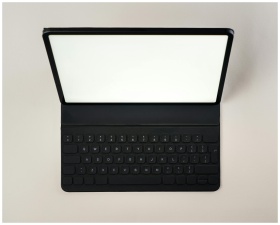 Flat lay of a tablet mounted on a keyboard, ideal
