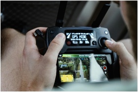 Close-up of hands operating a modern drone controller with GPS mode displayed.
