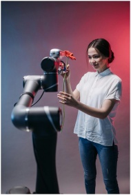 A woman interacts with a robotic arm holding a flo