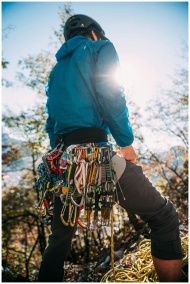 A mountain climber stands equipped with gear, facing the sun in an outdoor adventure setting.