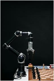 A robotic arm strategically playing chess, symboli