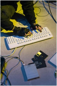 Cyberpunk-themed image showing a hacker typing on a keyboard with retro technology.